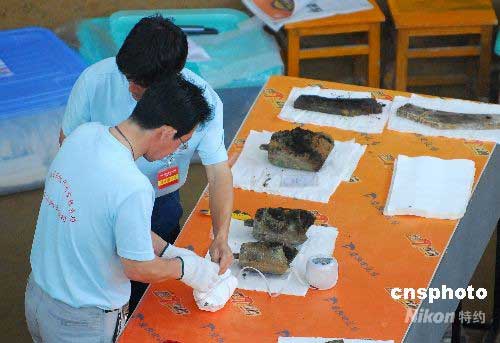 考古人員在對提取上來的青銅器進(jìn)行簡單處理。中新社發(fā) 從啟 攝