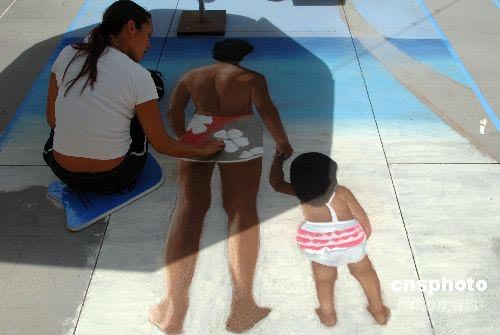一名畫家正在創作粉筆畫《看海》。中新社發 張煒 攝