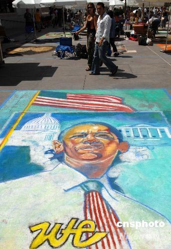 一幅憧憬奧巴馬入主白宮的巨型粉筆畫吸引觀眾。中新社發 張煒 攝