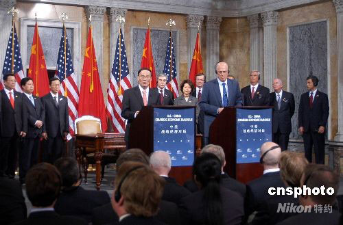 當地時間6月18日下午,剛剛結束中美第四次戰略經濟對話的中國副總理王岐山和美國財政部長保爾森,在華盛頓共同會見記者。隨后雙方簽署《中美能源環境十年合作框架》文件。中新社發 管黎明 攝