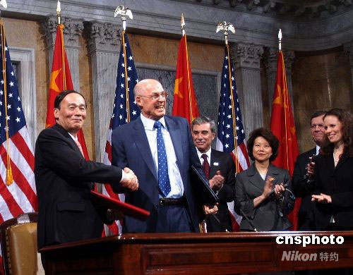 當地時間6月18日,中美在華盛頓簽署《中美能源環境十年合作框架》文件。圖為中國副總理王岐山和美國財政部長保爾森在簽字儀式上。中新社發 管黎明 攝