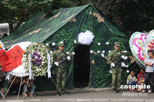 鐵軍為犧牲的抗震官兵武文斌搭建的簡易靈棚。