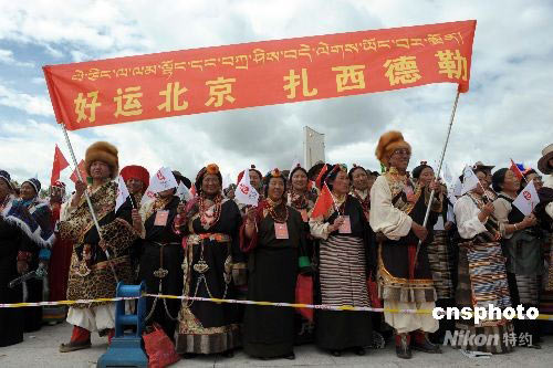 藏族民眾身穿節(jié)日盛裝高舉用漢藏兩種文字書寫的大幅標語祝福北京奧運。 中新社發(fā) 廖攀 攝