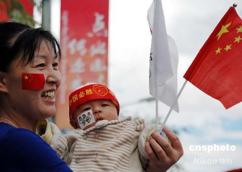 出生才60天的一名小寶寶周思璇同媽媽一道在街頭喜迎奧運火炬到達高原圣城。 中新社發 周波 攝