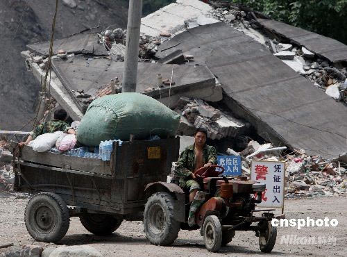 四川汶川大地震破壞最嚴重的震中地區映秀鎮,六月中旬有許多村民開拖拉機返鄉,準備重建家園。中新社發 賈國榮 攝