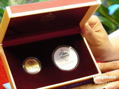 6月23日,中國人民銀行公開發行北京2008年殘奧會金銀紀念幣一套,其中三分之一盎司金幣和一盎司銀幣各一枚。該套紀念幣正面圖案均為北京2008年殘奧會會徽(彩色),并刊國名、年號。金質幣直徑23毫米,面額150元人民幣,最大發行量15000枚。銀質幣直徑40毫米,面額10元人民幣,最大發行量30000枚。從即日起,該套紀念幣將通過中國金幣總公司各網點機構向公眾銷售。中新社發 沈嘉 攝