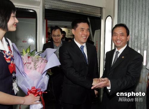 6月23日下午,臺北市長郝龍斌抵達上海浦東國際機場,開始對上海進行為期5天的訪問,這是新中國成立以來,臺北市長首次訪問上海。圖為上海市臺辦主任楊建榮(右)到機場迎接。中新社發 潘索菲 攝