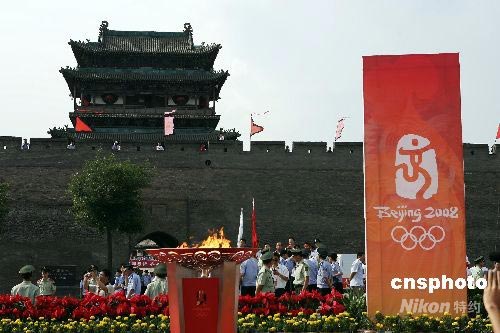 6月25日,奧運(yùn)火炬在山西平遙古城順利傳遞。整個(gè)傳遞過(guò)程中的唯一一次古城墻之旅,充分展現(xiàn)了平遙深邃的歷史特色。中新社發(fā) 張?jiān)?攝