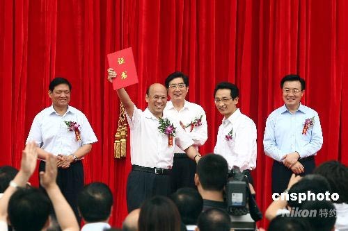 6月28日,北京奧運(yùn)會(huì)主體育場“鳥巢”正式落成,北京市副市長、北京市“2008”工程指揮部指揮陳剛(右二)在落成典禮上致詞,并向國家體育場有限責(zé)任公司董事長李愛慶(左二)交付竣工驗(yàn)收合格證書。中新社發(fā) 盛佳鵬 攝