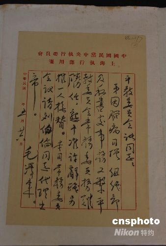 這是中國(guó)國(guó)民黨黨史館館藏的一九二四年毛澤東致平教委員會(huì)諸同志的一封親筆信。中新社發(fā) 耿軍 攝