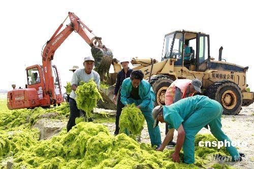 圖為乳山市民眾在近海清理海灘與近海的滸苔。中新社發(fā) 劉國賢 攝
