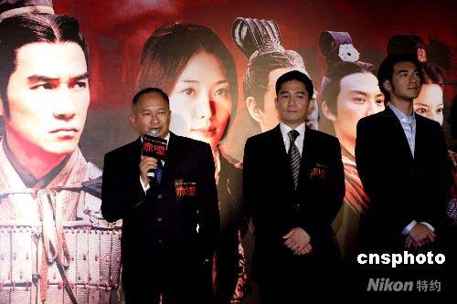 電影《赤壁》在香港舉行慈善首映,劇中主要演梁朝偉、金城武等出席。該片耗資巨大,拍攝過程波折不斷,吳宇森(左)現場介紹拍攝經過。中新社發 王麗南 攝