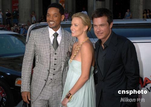 當(dāng)?shù)貢r(shí)間六月三十日晚,索尼電影公司出品的喜劇動(dòng)作片《全民超人》(Hancock)在好萊塢中國(guó)劇場(chǎng)舉行盛大首映式,明星紅地毯走秀規(guī)模堪比奧斯卡頒獎(jiǎng)禮。圖為影片男主角扮演者威爾·史密斯(左)、女主角扮演者查理茲·塞隆和男二號(hào)扮演者杰森·貝特曼共同出席首映式。中新社發(fā) 張煒 攝