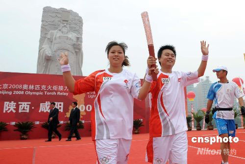 7月3日下午,奧運火炬在陜西咸陽傳遞,射擊運動員張波和射箭運動員張敏攜手從統(tǒng)一廣場的秦始皇雕像下跑出咸陽火炬?zhèn)鬟f第一棒。 中新社發(fā) 廖攀 攝
