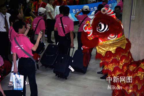 七月四日八時(shí)三十八分,兩岸周末包機(jī)大陸福建首發(fā)團(tuán)乘坐廈門航空公司B757客機(jī)抵達(dá)臺(tái)北松山機(jī)場。松山機(jī)場舉行了隆重的歡迎儀式。(中新社記者 徐長安/攝)