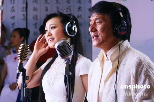 7月7日,國(guó)際巨星成龍與著名歌唱家譚晶在北京攜手錄制北京2008奧林匹克公園中心區(qū)文化展示活動(dòng)“中國(guó)故事”的主題歌《中國(guó)看見(jiàn)》。中新社發(fā) 李慧 攝