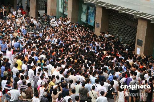 10元面值的可等值流通貨幣北京奧運(yùn)紀(jì)念鈔迅速在民間刮起了一股收藏旋風(fēng),掀起了全民收藏?zé)崆椤?月9日,面值10元的奧運(yùn)紀(jì)念紙幣在南京的8家定點(diǎn)銀行發(fā)行。位于三元巷的一家定點(diǎn)銀行門前聚集了數(shù)百市民,現(xiàn)場(chǎng)有數(shù)十警察維持秩序。中新社發(fā) 彭增權(quán) 攝