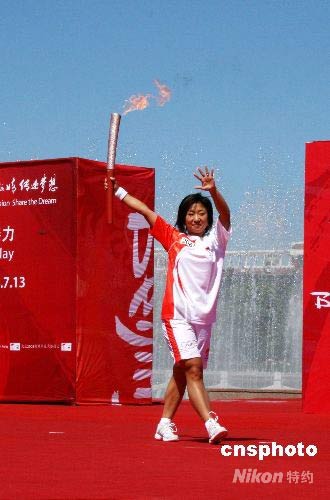 7月13日,北京奧運火炬在齊齊哈爾傳遞,短道速滑世界冠軍付天余在自己的家鄉擔任最后一棒火炬手。 中新社發 周兆軍 攝