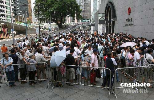 七月十五日,數(shù)千香港市民在中銀香港總部外等待領(lǐng)取奧運紀(jì)念鈔票購物憑證。三百七十六萬張港幣奧運紀(jì)念鈔票十六日才發(fā)售,但在開售前的五十小時,已有數(shù)以千計的市民前往中銀相關(guān)分行外排隊等候。中新社發(fā) 武仲林 攝