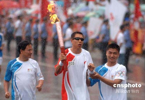 7月16日下午,奧運火炬在吉林延吉傳遞,雅典殘奧會冠軍李端在護跑手引導下傳遞火炬。中新社發 廖攀 攝