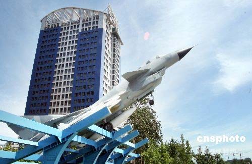 2008年7月17日,殲十飛機景觀工程在中國航空工業(yè)第一集團公司總部前“一航花園”隆重揭幕。這標志著殲十飛機景觀工程正式落戶朝陽CBD。這架殲十是完全根據(jù)真機的一比一高仿模型,機上細節(jié)分毫畢現(xiàn)。殲十作出大仰角爬升的姿態(tài),翼下掛有國產(chǎn)雷石6滑翔制導(dǎo)炸彈、霹靂9C近距格斗空空導(dǎo)彈及霹靂12中距空空導(dǎo)彈。中新社發(fā) 博芽影像 攝