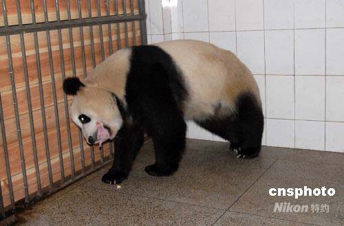 臥龍大熊貓“幗幗”在親自喂養雙胞胎中的老大。中新社發 羅小韻 攝