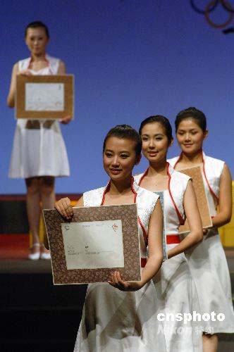 7月17日晚,北京奧運頒獎證書在北京正式發布。圖為奧運禮儀志愿者展示證書。中新社發 王東明 攝