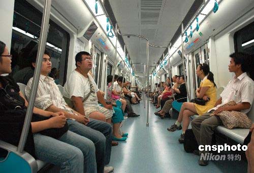圖為地鐵10號線首次運行中車上乘客井然有序。中新社發(fā) 張雙雙 攝