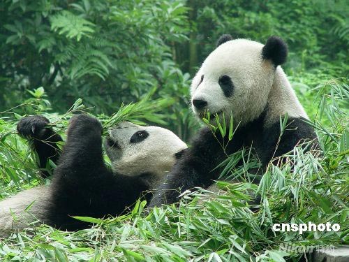 7月中旬,在四川雅安碧峰峽大熊貓基地里,大熊貓“團團”(右)和“圓圓”在一起吃竹子。“5·12”汶川大地震,使距離震中約30公里的四川臥龍中國保護大熊貓研究中心遭到毀滅性打擊,60多只圈養大熊貓無家可歸。從5月18日起,臥龍中國保護大熊貓研究中心啟動了自創立以來首次進行的、疏散轉移全部圈養大熊貓的行動。贈臺大熊貓“團團”“圓圓”被轉移至雅安市碧峰峽大熊貓基地。目前,“團團”“圓圓”的身體早已恢復到地震前的水平,體重還有所增加,“團團”體重達112公斤,“圓圓”為111公斤。中新社發 羅小韻 攝