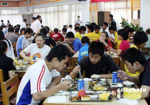 圖為運(yùn)動(dòng)員餐廳內(nèi),選手們正享美食,有燉牛肉、蒸雞蛋、炒時(shí)蔬,還有各樣水果,中西餐兼?zhèn)洌澦卮钆洌育R全。中新社發(fā) 黃少華 攝