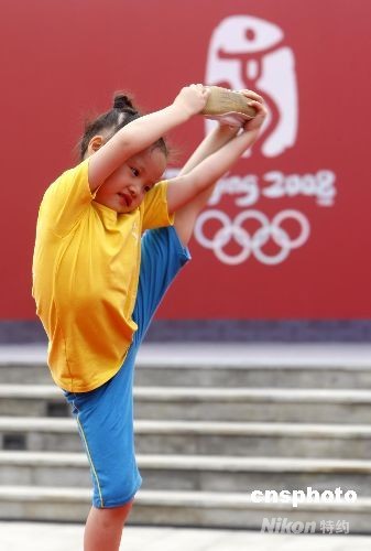 7月27日,北京奧運村正式開村。一名參加表演的女孩在開村儀式前做準備活動。 中新社發 杜洋 攝