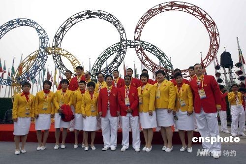 7月27日,北京奧運村正式開村。中國代表團部分運動員(舉重、摔跤、柔道)在奧運村合影。中新社發 杜洋 攝