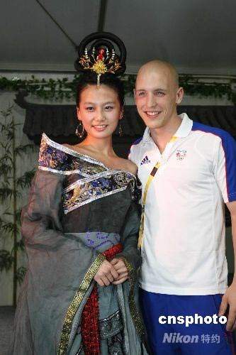圖為英國跳水隊員和奧運村茶館里的女演員一起合影。中新社發(fā) 杜洋 攝