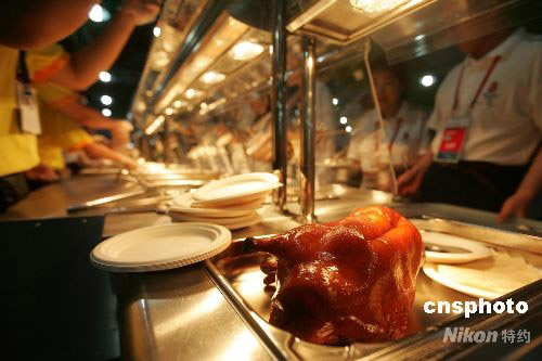 7月30日,北京奧運(yùn)村餐廳正在精心準(zhǔn)備著名的北京烤鴨。北京奧運(yùn)村已正式開村,入住者可以享受到自己喜歡的各種衛(wèi)生可口的飯菜。各國(guó)運(yùn)動(dòng)員在奧運(yùn)村餐廳可品嘗到正宗的北京全聚德烤鴨。奧運(yùn)村餐廳每天為運(yùn)動(dòng)員提供600只烤鴨,而且都是由服務(wù)員卷好的由烤鴨片、黃瓜條、蔥絲組合的烤鴨卷。 奧運(yùn)村餐廳每天24小時(shí)提供餐飲服務(wù),每小時(shí)提供不少于6000人的用餐,有450多種食物品種,運(yùn)動(dòng)員菜品7天不重復(fù)。北京奧運(yùn)會(huì)的餐飲服務(wù)被廚師們比喻為“餐飲業(yè)的奧運(yùn)會(huì)”。據(jù)北京奧組委預(yù)計(jì),奧運(yùn)期間供餐將超過(guò)1300萬(wàn)份。要讓所有用餐者吃得可口更要吃得安全,對(duì)于每一位“奧運(yùn)廚師”來(lái)說(shuō)都是一次極大的考驗(yàn)。 北京奧運(yùn)會(huì)奧運(yùn)村部副部長(zhǎng)鄧亞萍表示:“我們聘請(qǐng)了具有8屆夏季奧運(yùn)會(huì)和5屆冬奧會(huì)餐飲服務(wù)經(jīng)驗(yàn)的國(guó)際餐飲公司承擔(dān)奧運(yùn)村的主餐廳、分餐廳和國(guó)際區(qū)咖啡廳的餐飲服務(wù)工作,共有100位來(lái)自世界各國(guó)的外籍工作人員和2300位來(lái)自全國(guó)各地的廚師和服務(wù)人員,從27日開始24小時(shí)為村民提供可口的飯菜。”