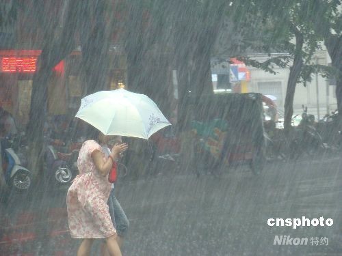 8月6日中午,海口受熱帶風暴“北冕”影響,不時下起瓢潑大雨。據海南省氣象臺預報,當日白天到夜間,海南島除西部外均將有大到暴雨。圖為行人艱難地在雨中行走。中新社發 付美斌 攝