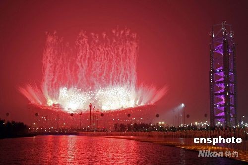 8月8日,第29屆夏季奧運(yùn)會(huì)在北京國(guó)家體育場(chǎng)開幕,絢麗的煙火映紅北京的夜空。中新社發(fā) 盛佳鵬 攝
