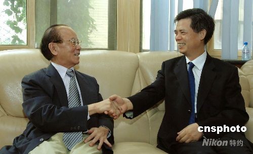8月9日,臺(tái)灣“中央社”董事長(zhǎng)黃肇松一行訪(fǎng)問(wèn)中國(guó)新聞社。圖為黃肇松(左)與中新社社長(zhǎng)郭招金交談。中新社發(fā) 鄒憲 攝