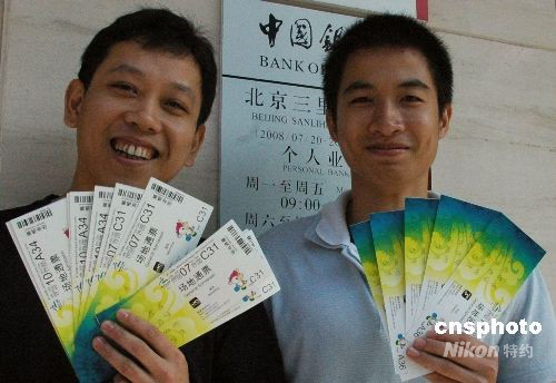 8月15日,2008年北京殘奧會體育比賽門票在北京地區(qū)的30個中國銀行門票代售網(wǎng)點銷售,并提供現(xiàn)場打印門票服務(wù)。公眾持有效身份證件在代售網(wǎng)點排隊實時購票,每人每次最多買2個場次共10張門票。目前共有205個比賽場次80萬張比賽門票供銷售,購票時間截至到9月17日。圖為來自廣東的民眾高興地買到殘奧會門票。 中新社發(fā) 張雙雙 攝