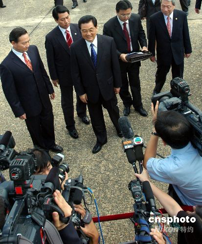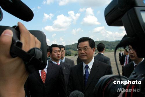 中國(guó)國(guó)家主席胡錦濤八月二十五日中午抵達(dá)韓國(guó)首都首爾,胡錦濤在機(jī)場(chǎng)對(duì)記者發(fā)表講話(huà)。