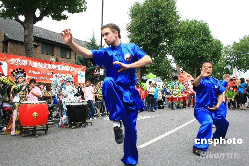 當地時間25日,歐洲最大規模的街頭文化藝術節——一年一度的英國諾丁山狂歡節在倫敦舉行,今年的主題是“歡迎世界”。圖為當地青年在表演中國武術。中新社發 李鵬 攝