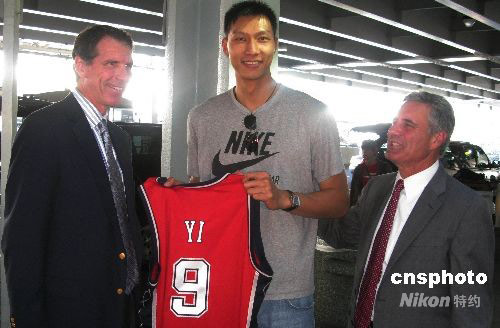 當地時間9月8日下午,本賽季將代表新澤西網隊征戰NBA的中國球員易建聯抵達紐約肯尼迪機場。他將在一周后參加網隊“新秀訓練營”,為新賽季做準備。網隊總經理奇奇·范德維奇(左)和執行副主席里奧·埃爾萊(右)帶著易建聯的新球衣到機場迎接。中新社發 李靜 攝