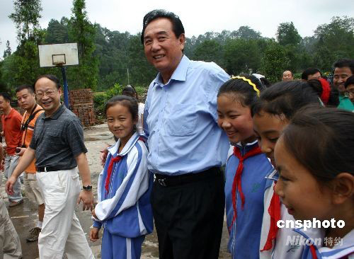 9月9日上午,海協會會長陳云林來到四川地震災區雅安市中里鎮,先后考察了中里鎮中學、中里鎮中心小學和鄭灣村小學的教育重建情況。圖為陳云林與鄭灣村小學的學生們在一起。中新社發 黃永莉 攝