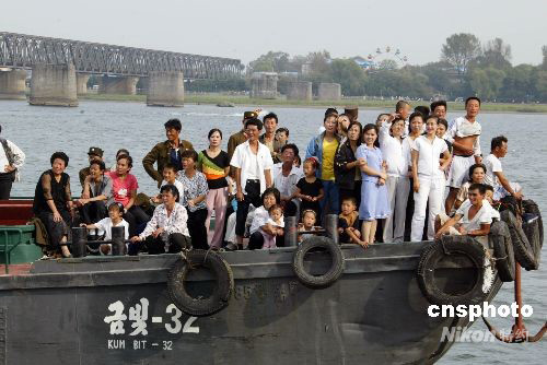 9月9日正值朝鮮國慶,朝鮮新義洲民眾有組織地乘船游覽鴨綠江。中新社發 陳浩浩 攝