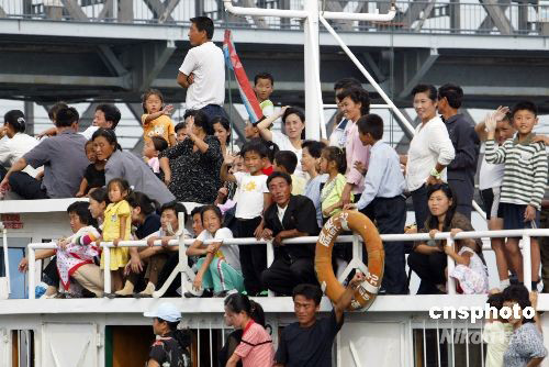 9月9日正值朝鮮國慶,朝鮮新義洲民眾有組織地乘船游覽鴨綠江。中新社發 陳浩浩 攝