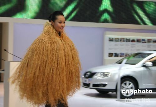 第11屆成都國際車展向媒體開放,一美女車模著“稻草”裝現身。 中新社發 霍潺 攝
