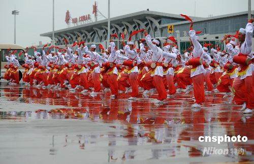 9月22日上午,以中共中央政治局常委、中央紀委書記賀國強為團長的中央代表團,乘專機抵達銀川河東機場,受到寧夏回族自治區官員和民眾的熱烈歡迎。圖為寧夏回族青年舞動腰鼓歡迎中央代表團抵達銀川。中新社發 廖攀 攝