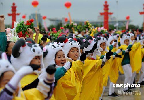 9月22日,中央人民政府向寧夏回族自治區贈送民族團結寶鼎儀式在銀川舉行,當地少年兒童扮作“羊寶寶”歡迎中央代表團。中新社發 廖攀 攝