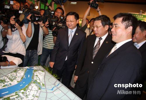 9月22日,“2010上海世界博覽會推介會”暨“走進世界博覽會”展覽活動在臺北開幕。出席開幕式的臺北市市長郝龍斌(右一)、上海常務副市長楊雄(右二)一起參觀上海世博會整體規劃展覽。中新社發 陳立宇 攝