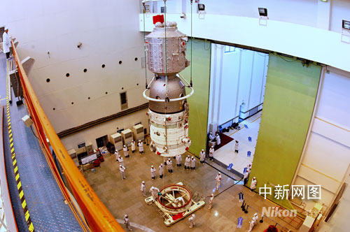 中國神舟七號載人航天飛船發(fā)射在即。圖為神舟七號飛船起吊(資料圖片)。袁明月 攝