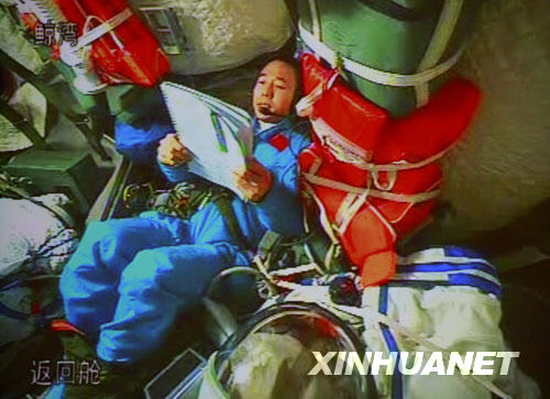 9月26日,航天員景海鵬在神舟七號載人飛船返回艙內與北京飛控中心通話(攝于北京航天飛行控制中心大屏幕)。25日發射成功的神舟七號載人飛船運行正常。新華社記者 查春明 攝